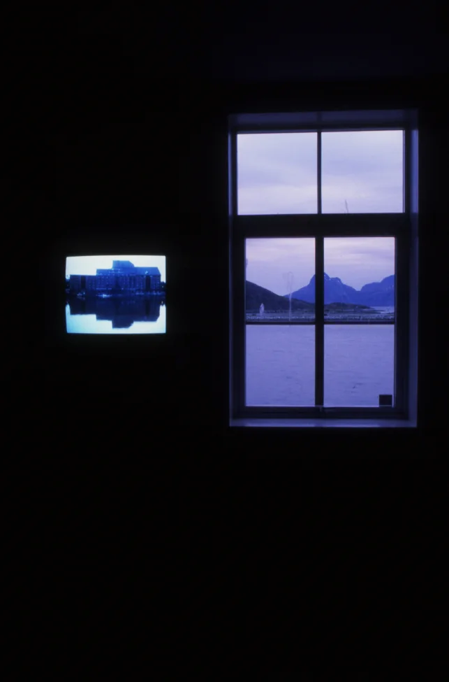 Video on 2 monitors on iron construction pedestal.