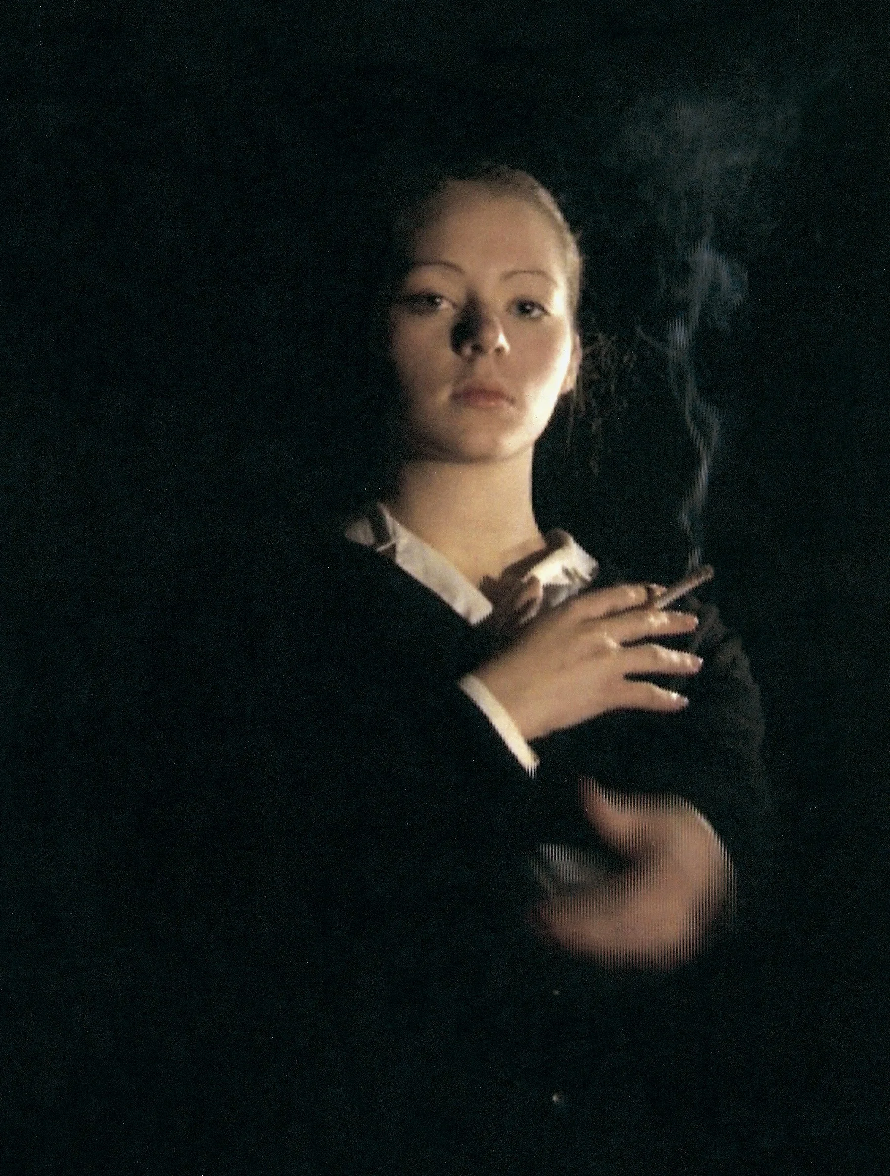 This video and sound installation is a portrait of a young girl. It shares, however, little of the poised and contemplative nature of Munch’s Self Portrait with Cigarette (1895) which it references. A young girl looks down at us from a flat video screen. With an air of arrogance she holds her right hand loosely across her chest, a burning cigarette balanced between her fingers. A remote control, within the grasp of her left, emerges from the deep darkness of the background. Defiantly, the young girl points it towards us, and with it she takes charge of our viewing experience. Loud bursts of drum ‘n base and garage music (2000) erupt at intervals from the speakers behind the viewer. portrait with cigarette captures the restless spirit of its subject which is at odds with the composed and often timeless character of the traditional painted portrait. The event and the work terminate when the cigarette burns out.